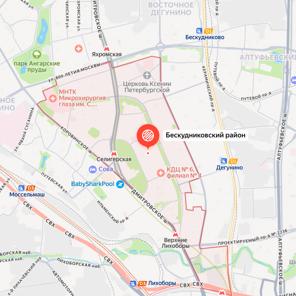 Бескудниковский район входит в Северный административный округ Москвы. Мастера «Чин Чинарем» выезжают на улицы Дубнинская, Бескудниковский бульвар, Софьи Ковалевской и в близлежащие кварталы. В пределах района мастер приезжает в течение часа, а заказы из-за МКАД выполняются до двух часов.