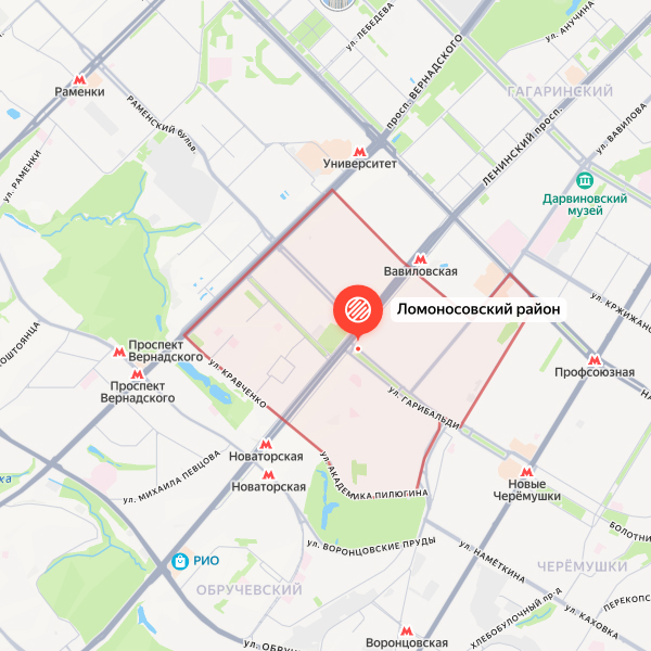 Ломоносовский район входит в Юго-Западный административный округ. Принимаем заявки с улиц Лобачевского, Удальцова, Кравченко, а также с других адресов внутри района. Метро — «Проспект Вернадского», «Новаторская», «Мичуринский проспект». Выезд в черте МКАД — бесплатный, мастер приедет с инструментами и приступит к работе после диагностики.