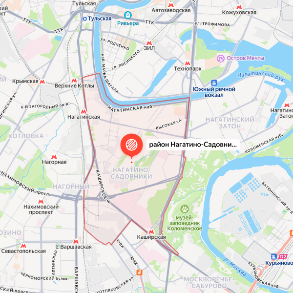 Нагатино-Садовники расположен в Южном административном округе Москвы. Сантехники «Чин Чинарем» выезжают по улицам Варшавское шоссе, Нагатинская, Садовники, Каширский проезд и Нагатинская набережная. Ближайшие станции метро — «Коломенская» и «Варшавская».