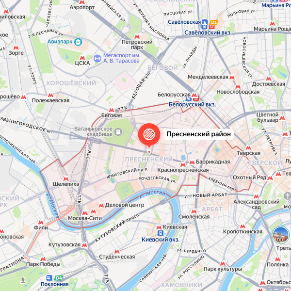 Пресненский район относится к Центральному округу. Мы обслуживаем дома и коммерческие помещения на Красной Пресне, улицах Заморенова, 1905 года, Трехгорном Валу, Звенигородском шоссе и других адресах в пределах района.