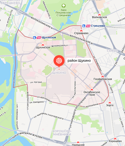 Территория обслуживания включает улицы Маршала Василевского, Авиационная, Академика Бочвара, Щукинская, а также близлежащие дома вблизи станций метро «Щукинская», «Октябрьское Поле» и «Полежаевская».