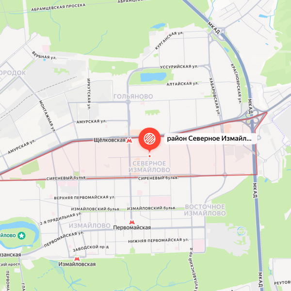 Северное Измайлово — район на востоке Москвы, входит в Восточный административный округ. Мы работаем на улицах 16-я Парковая, Щелковское шоссе, Константина Федина, Верхняя Первомайская и других адресах, относящихся к этому району.