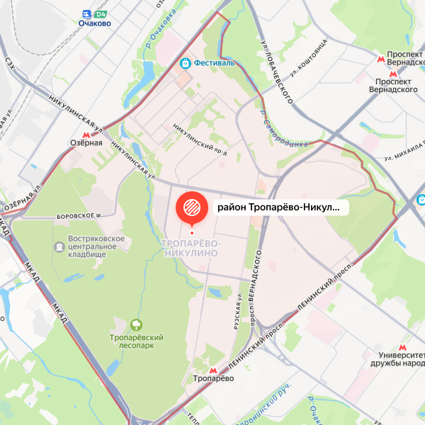 Компания «Чин Чинарем» выполняет услуги сантехника в районе Тропарёво-Никулино. Сервис работает в пределах Юго-Западного округа и обслуживает дома и офисы на улицах Академика Анохина, Винницкой, Ленинском проспекте, у метро «Юго-Западная» и «Тропарёво».