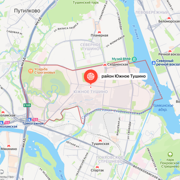 Южное Тушино входит в состав Северо-Западного административного округа Москвы. Сантехники выезжают по улицам Свободы, Яна Райниса, Туристская, Вилиса Лациса, а также в дома, расположенные рядом с метро «Сходненская» и «Планерная».