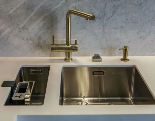 Мастер устанавливает смеситель, подсоединяет гибкие шланги и проверяет напор воды. Затем монтируется сифон, отвод для посудомоечной машины и при необходимости фильтр очистки.
