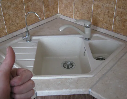 Если угловая раковина идет с тумбой, сначала устанавливается мебель, потом на нее крепится чаша. Для подвесных моделей обязательна несущая стена с обеих сторон угла. Мастер работает с вашими материалами.